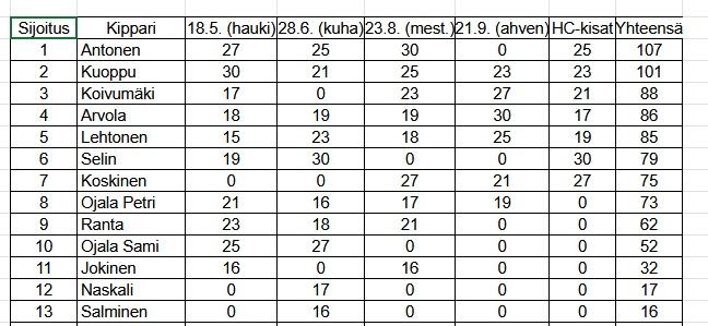 Pistekilpailu 2025Jäsentenväliseen uistelucuppiin lasketaan neljän (4) parhaan kisan pisteet. Tasapisteiden sattuessa ratkaisevat voitot/korkeimmat parhaat pisteet.